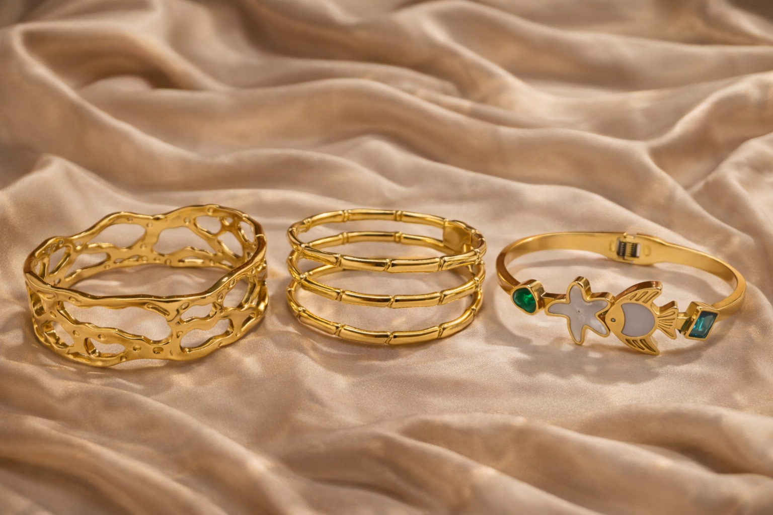 Make a bold coastal statement with the Ocean Treasure Gold Kada Bracelet Set, a premium gold kada bracelet set crafted for women who love artistic, standout jewelry. Inspired by ocean waves, coral textures, and marine life, this luxurious bracelet trio blends modern design with timeless elegance.