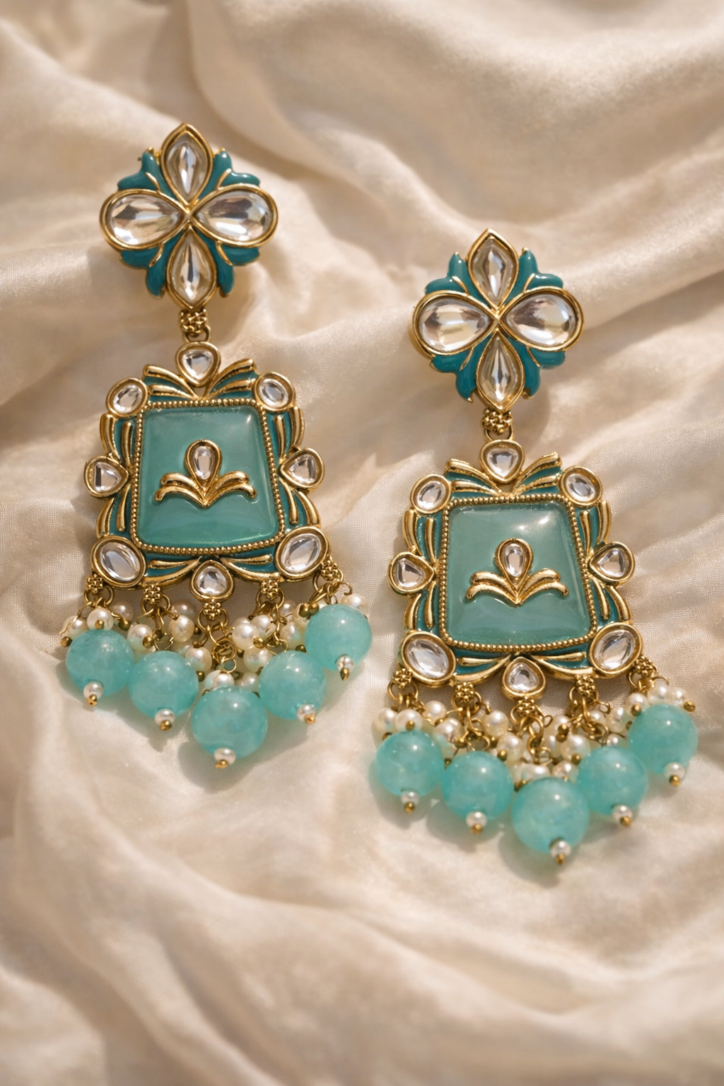 Crafted in an antique gold finish, these statement earrings feature a sparkling floral crystal stud, intricate Kundan-inspired detailing, and a soothing aqua enamel square centerpiece. Surrounded by delicate crystal accents and finished with cascading aqua jade bead drops and pearl clusters, these earrings create graceful movement and vibrant charm.