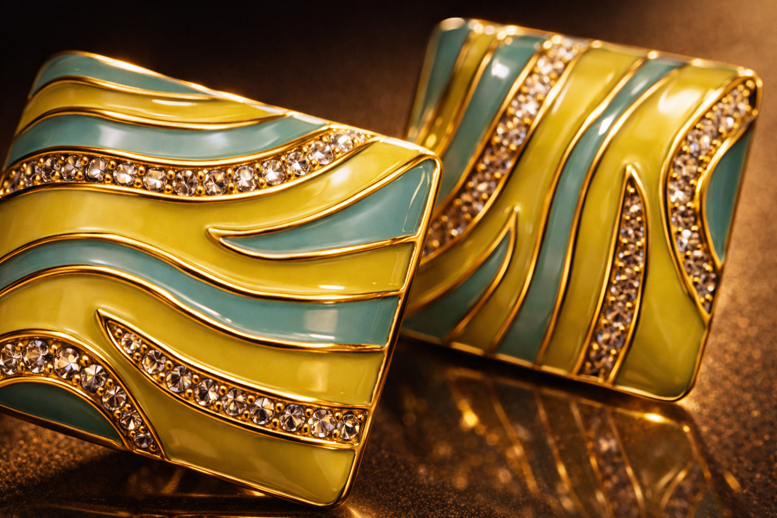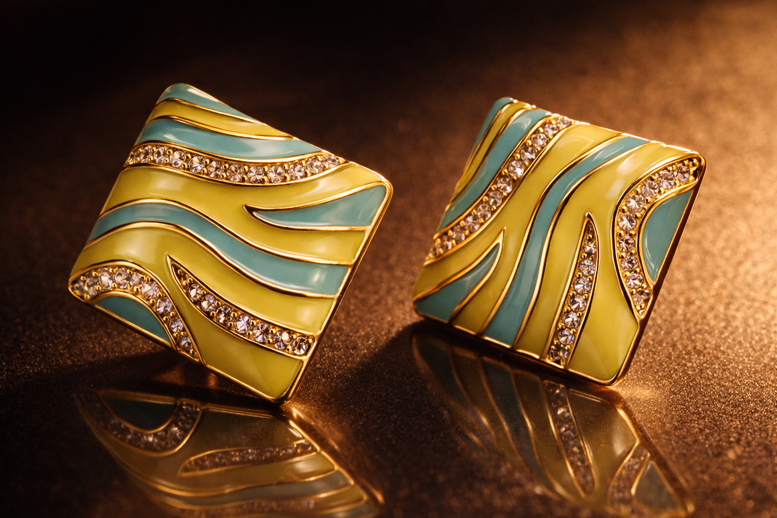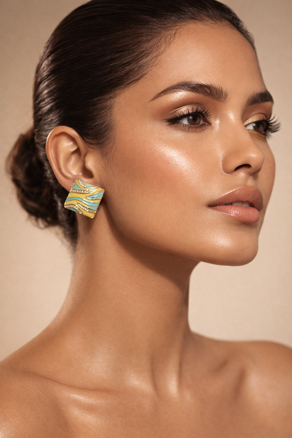 Add a splash of modern elegance to your jewelry collection with our Aurora Wave Luxe Enamel Stud Earrings. Designed with a stunning flowing wave pattern in lime yellow and turquoise blue enamel, these square statement studs are beautifully framed in polished gold with embedded crystal accents for extra sparkle.