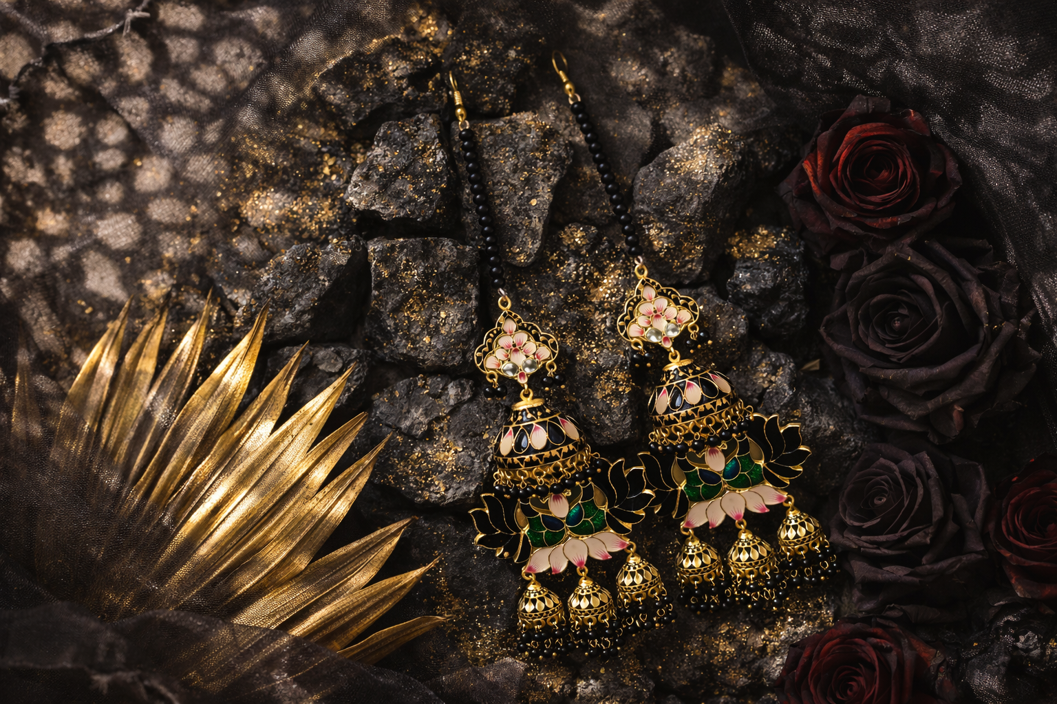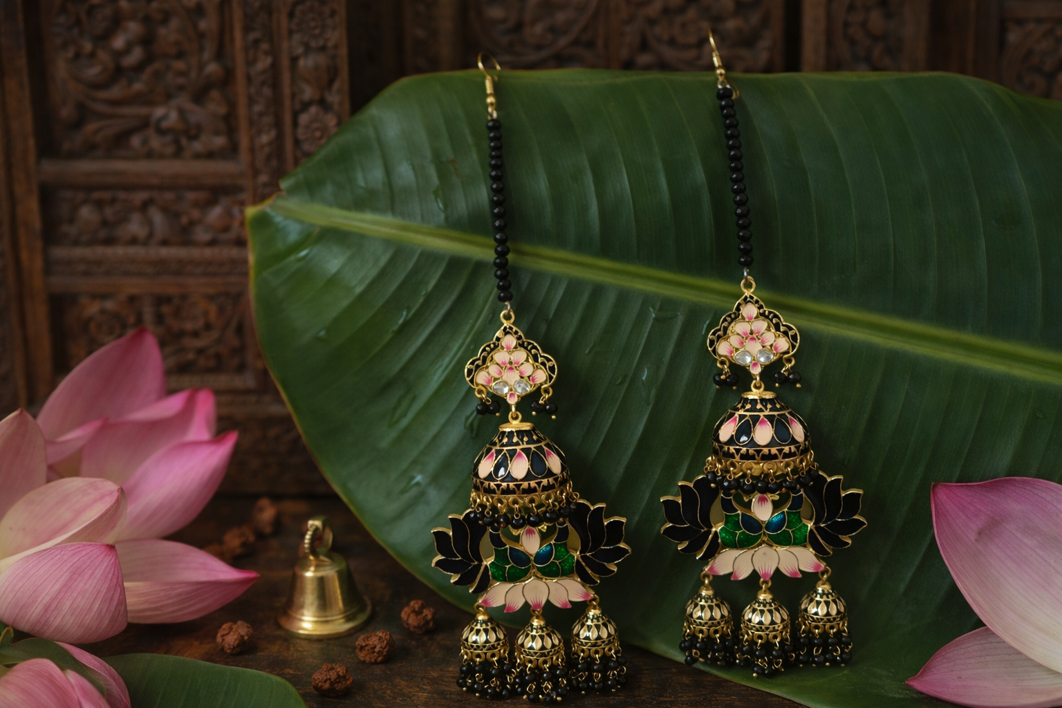 Elevate your traditional style with the Black & Gold Meenakari Long Dangle Earrings , beautifully crafted jhumka earrings designed to make a bold ethnic statement. Featuring intricate black and gold meenakari work, these long dangle earrings blend timeless artistry with festive elegance.