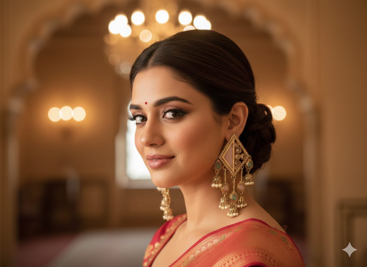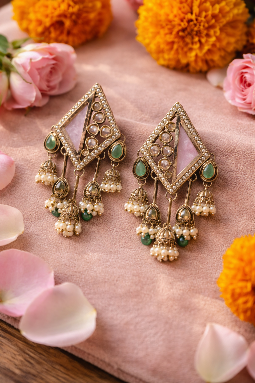 Make a bold royal statement with our Geometric Kundan Jhumka Earrings, a masterpiece of heritage design blended with contemporary elegance.