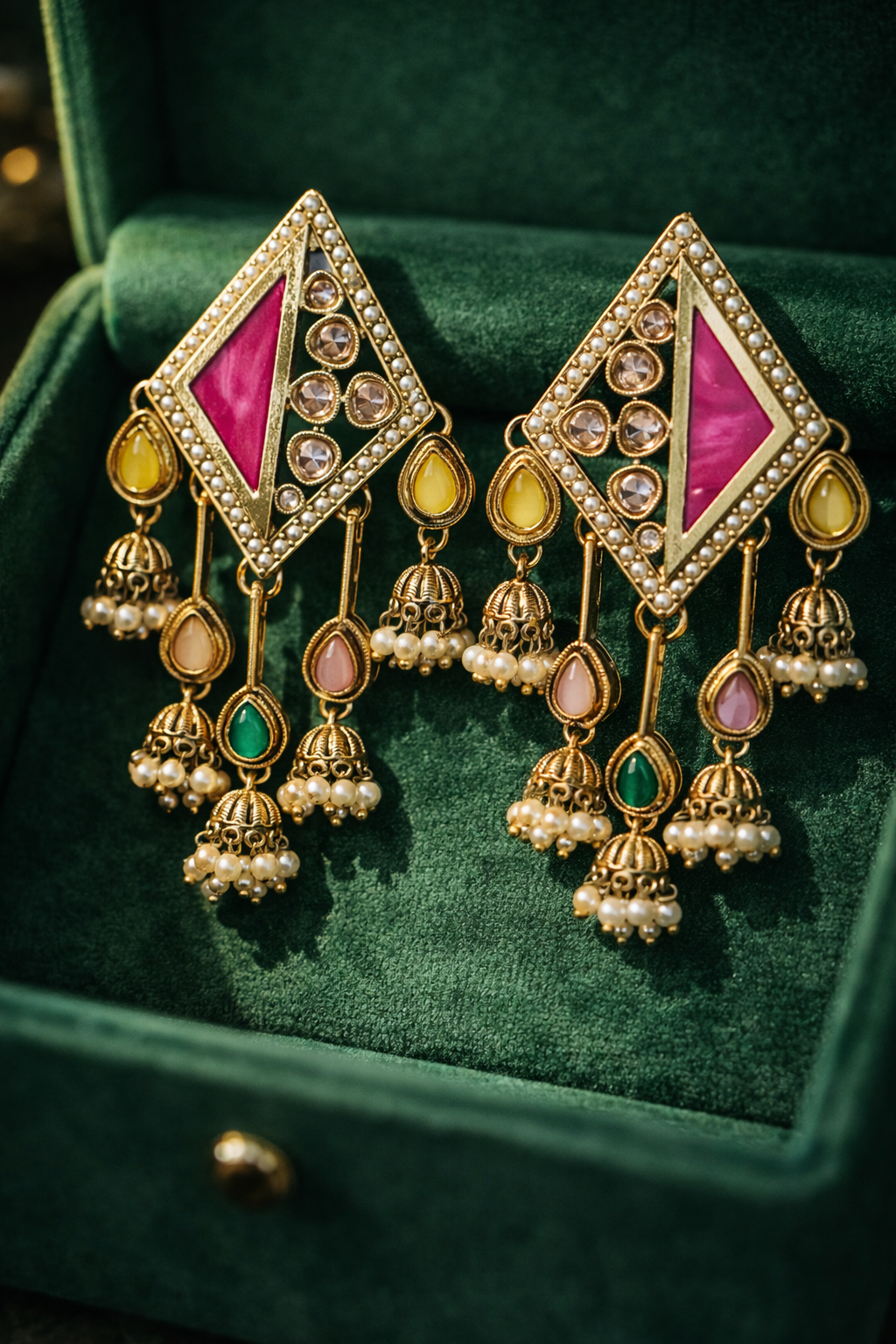 Make a bold royal statement with our Geometric Kundan Jhumka Earrings, a masterpiece of heritage design blended with contemporary elegance.