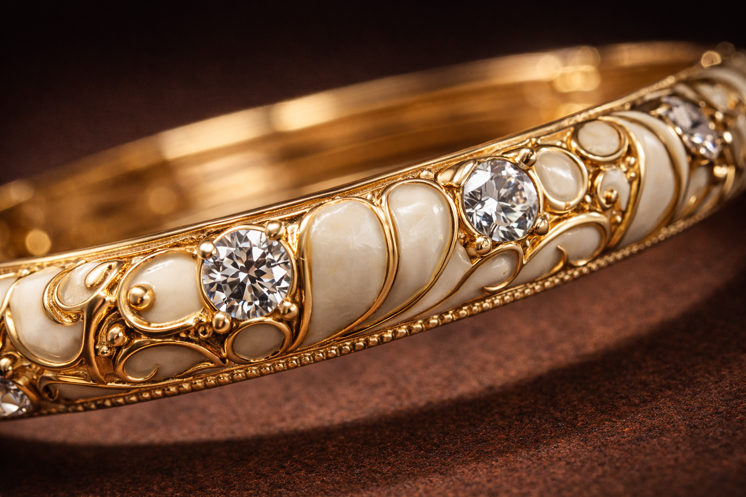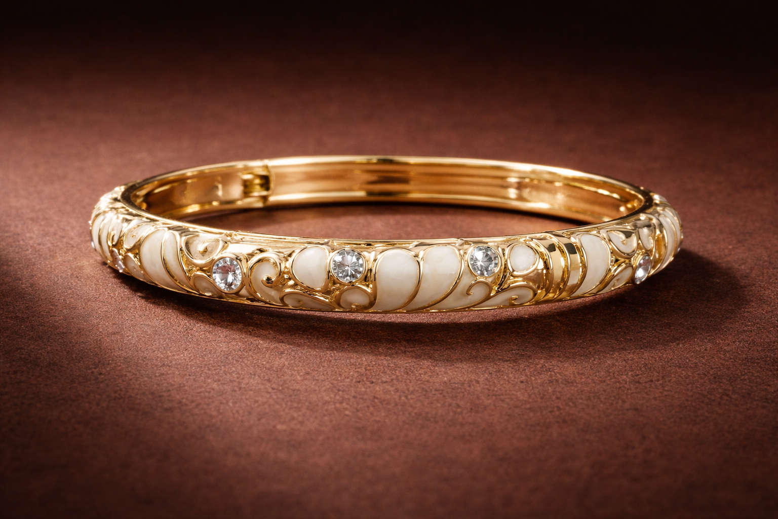 This ivory pearl and crystal gold bangle is a refined statement piece crafted for elegance and sophistication. Featuring smooth ivory enamel panels accented with brilliant round-cut crystal stones, this design blends classic charm with luxurious sparkle.