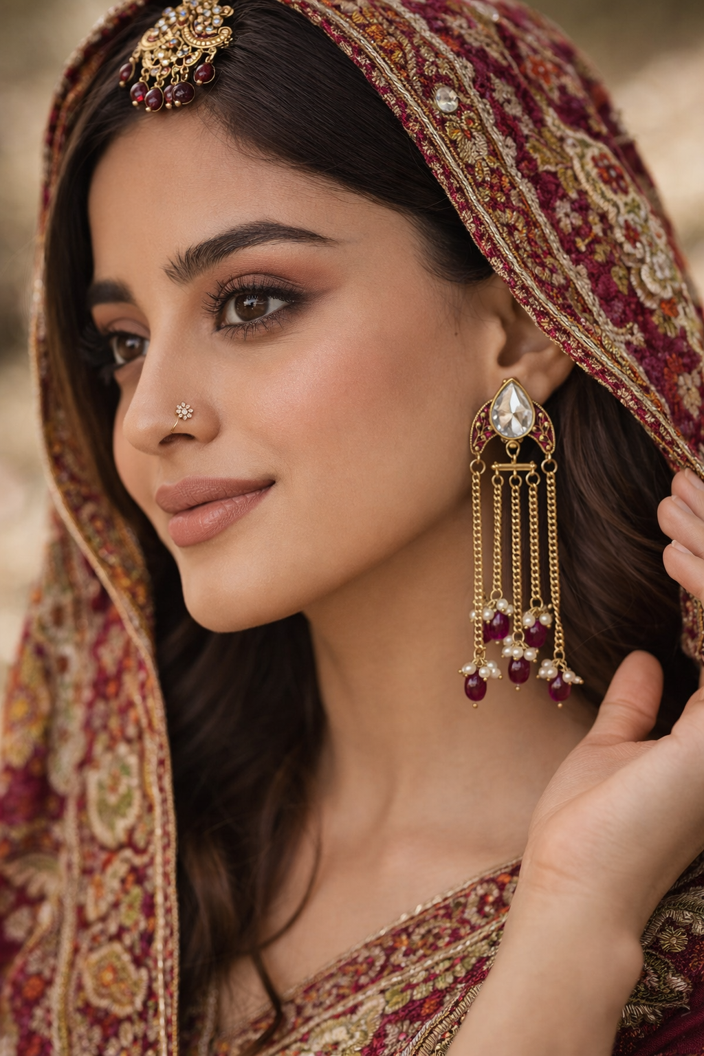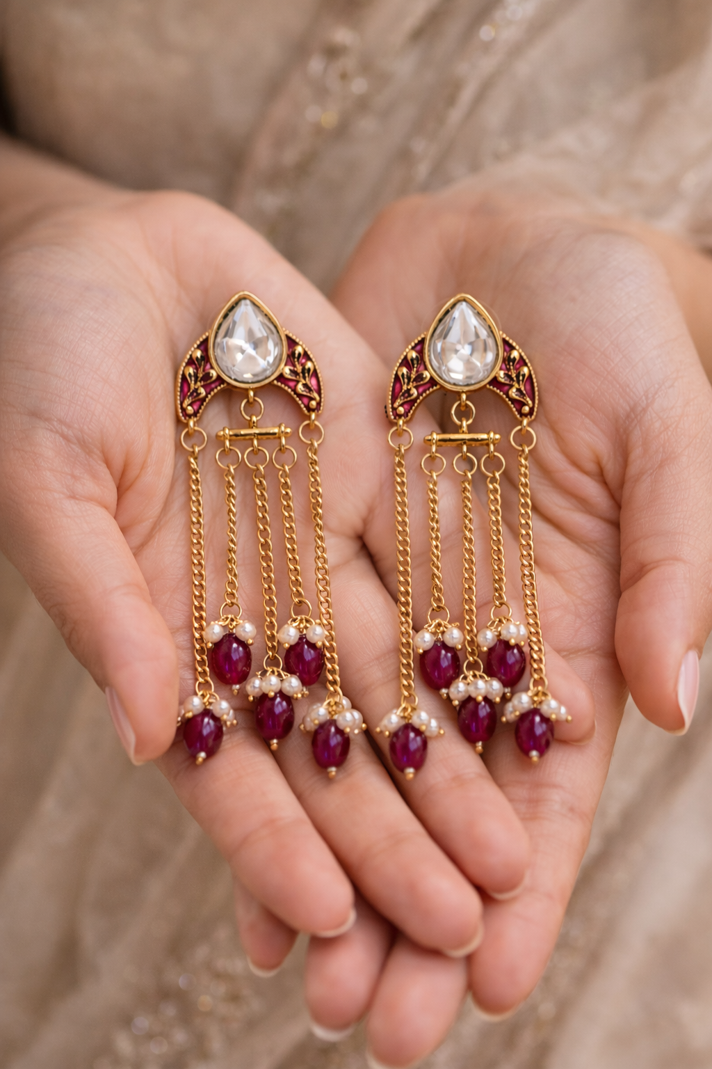 The design is elevated with deep ruby-toned bead drops and petite pearl clusters, adding richness and sophistication. The combination of gold chains, ruby beads, and pearl accents makes these earrings perfect for weddings, receptions, festive occasions, and evening celebrations.