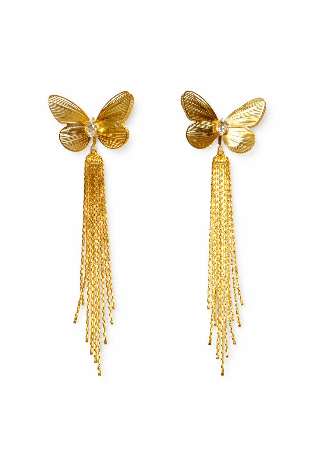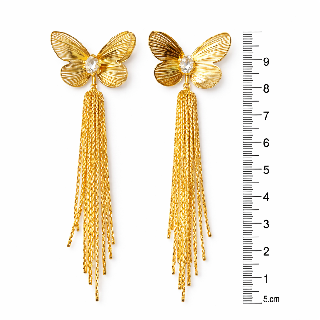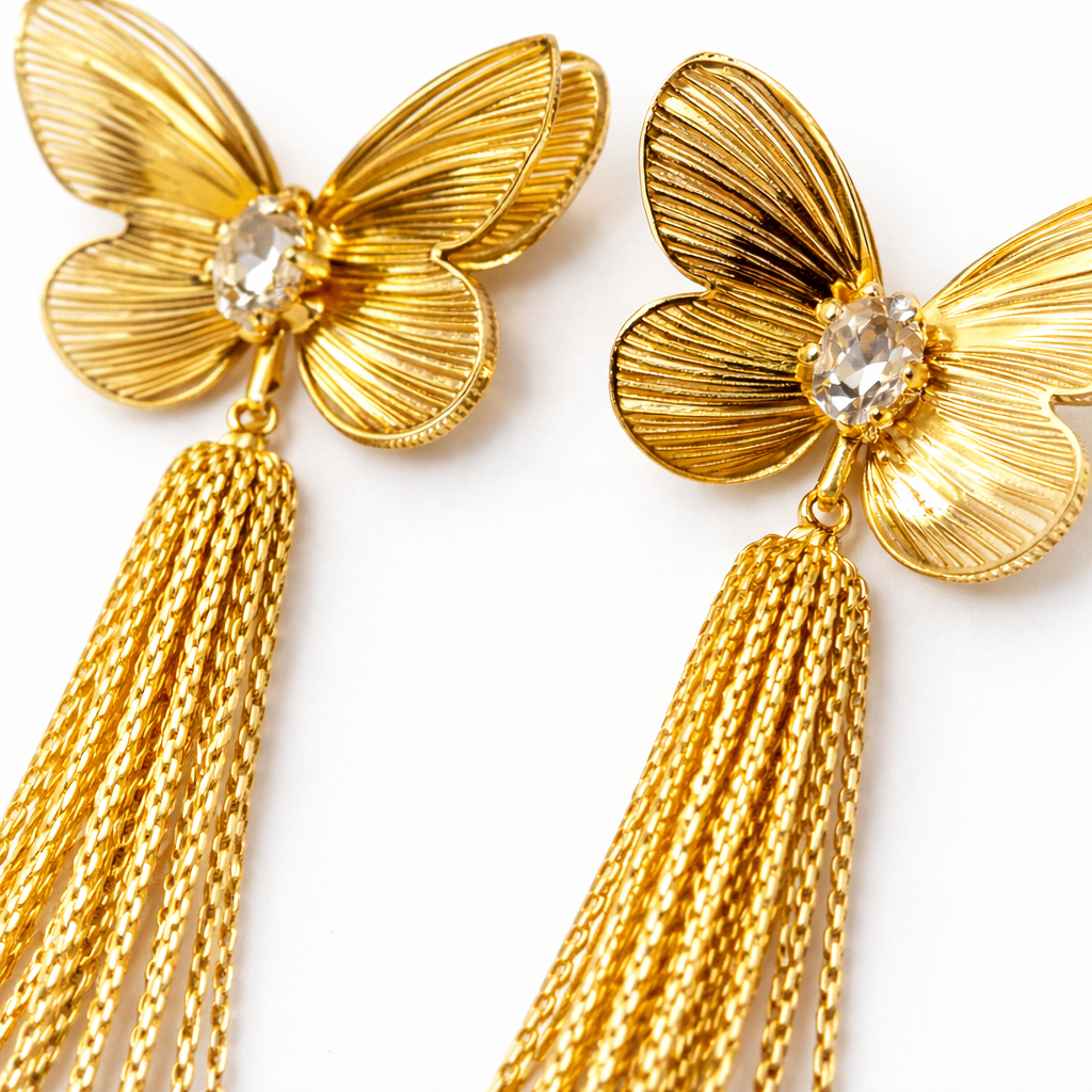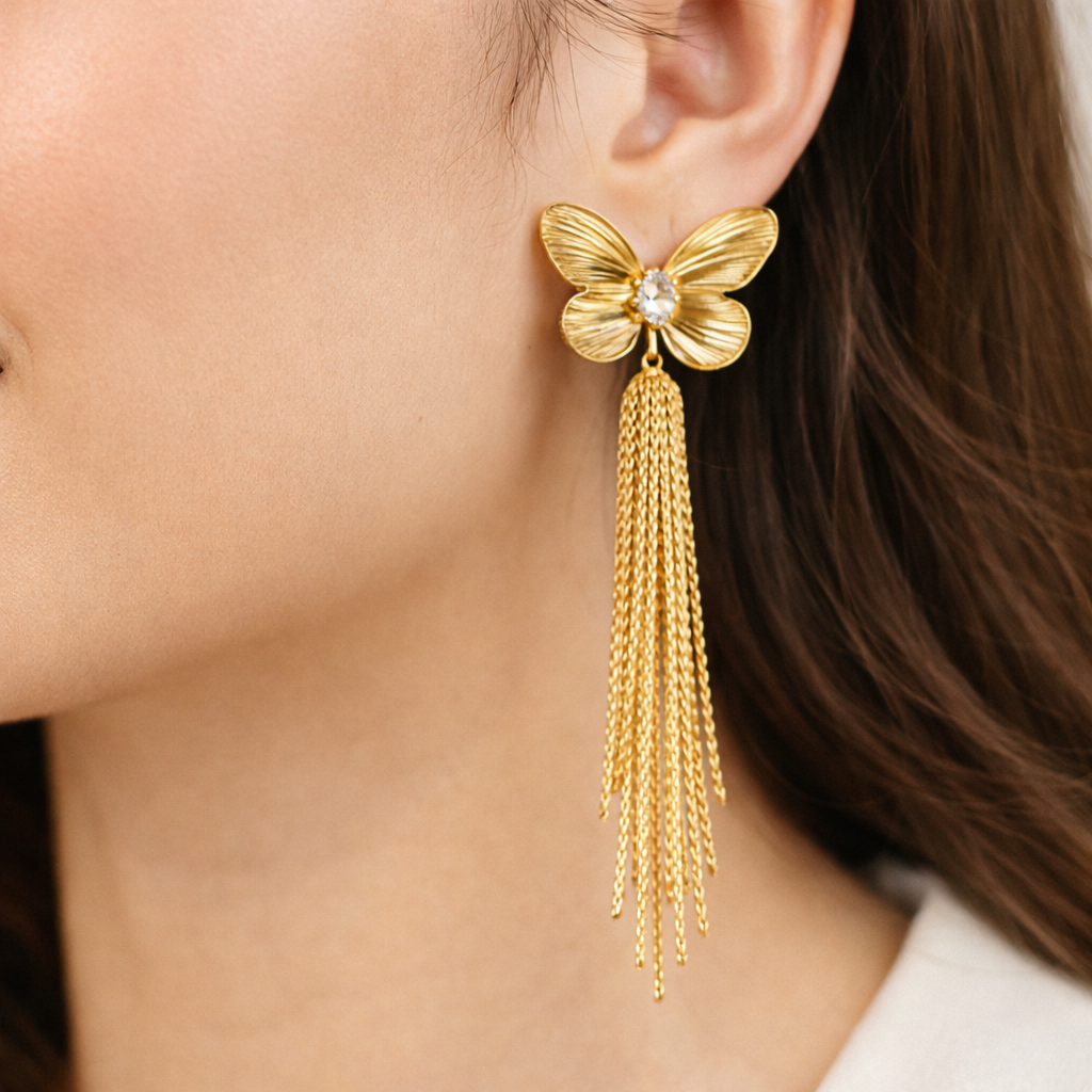 Rivaas Gold Butterfly Tassel Drop Earrings. Designed with intricately textured butterfly wings and a sparkling crystal centerpiece, these earrings capture the beauty of delicate craftsmanship and modern style.