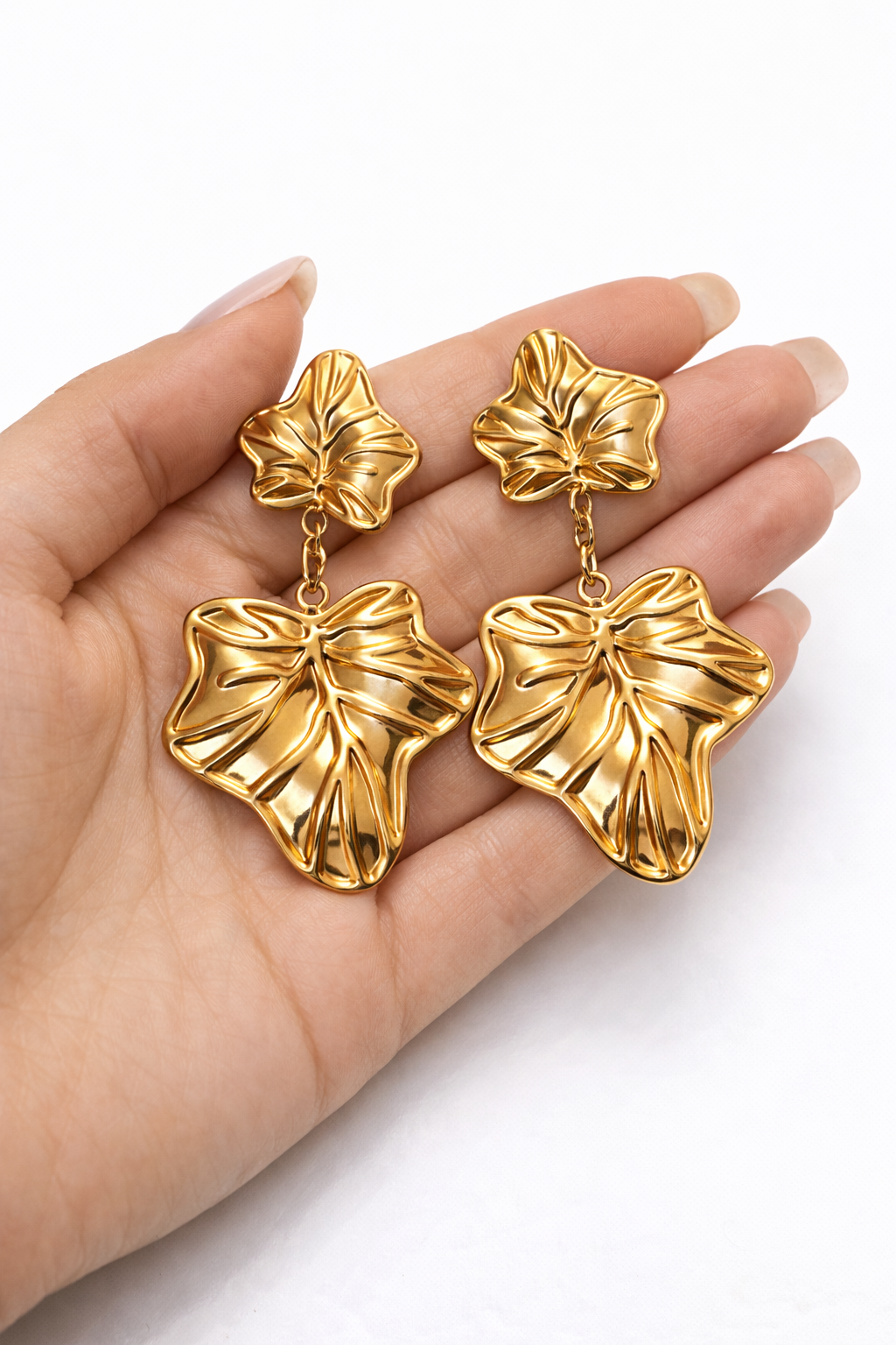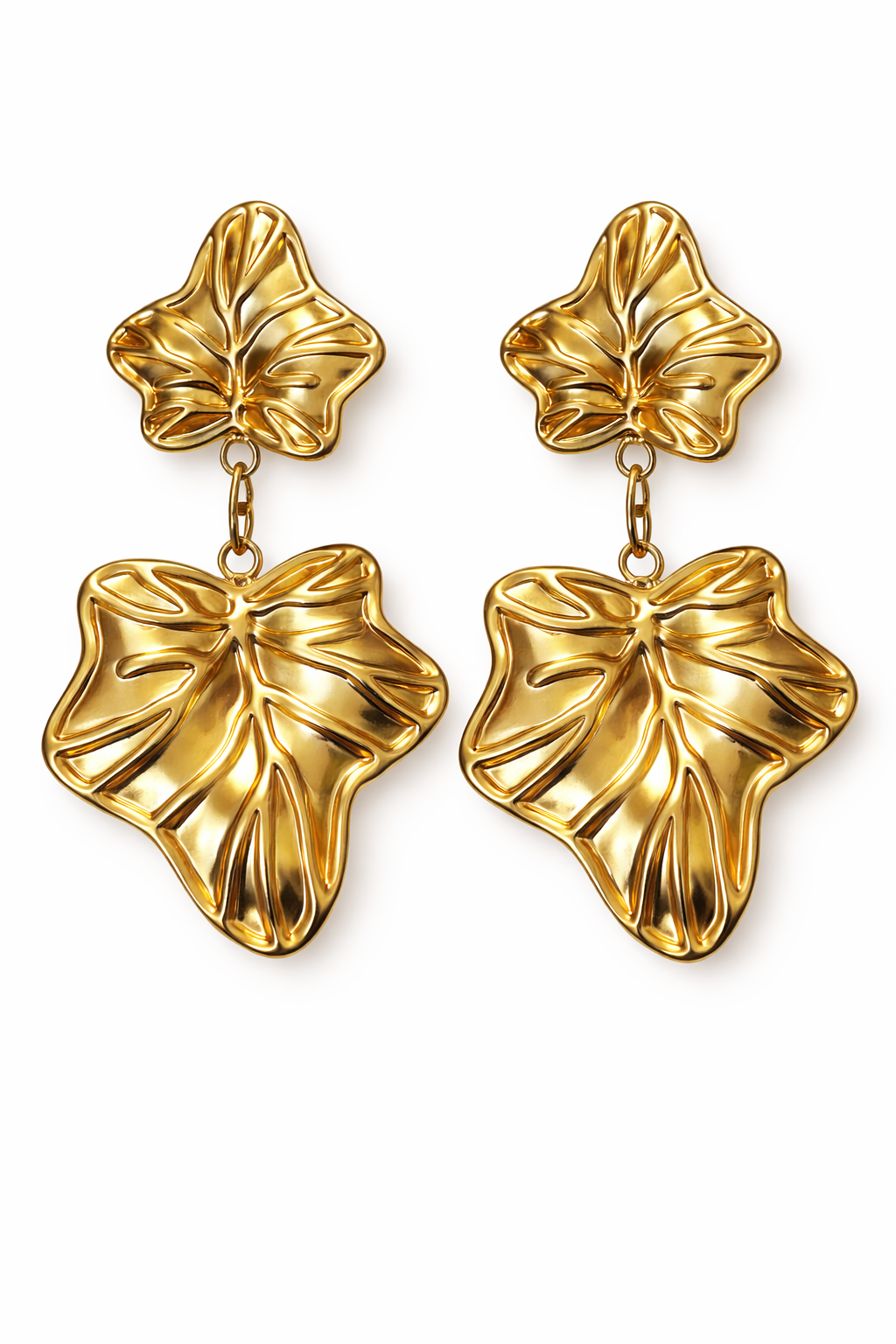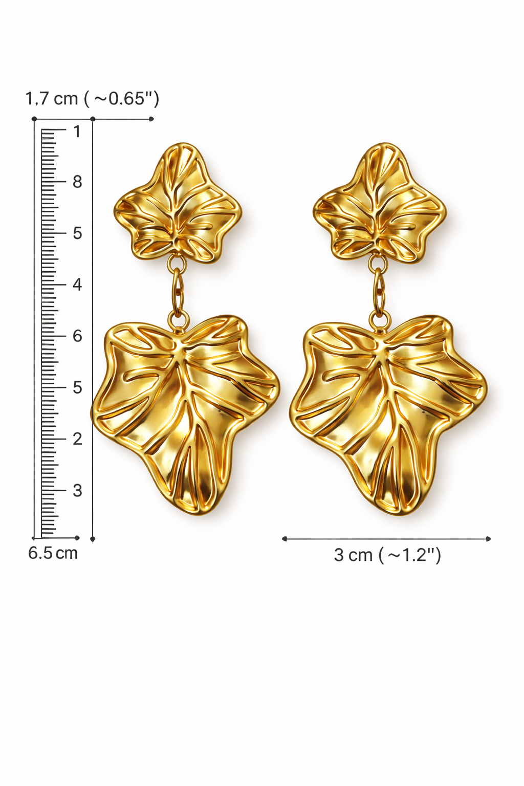 The earrings feature a smaller textured leaf stud connected to a larger dangling leaf, creating graceful movement and eye-catching shine. The polished metallic finish enhances the intricate leaf vein detailing, giving the earrings a bold yet refined look.