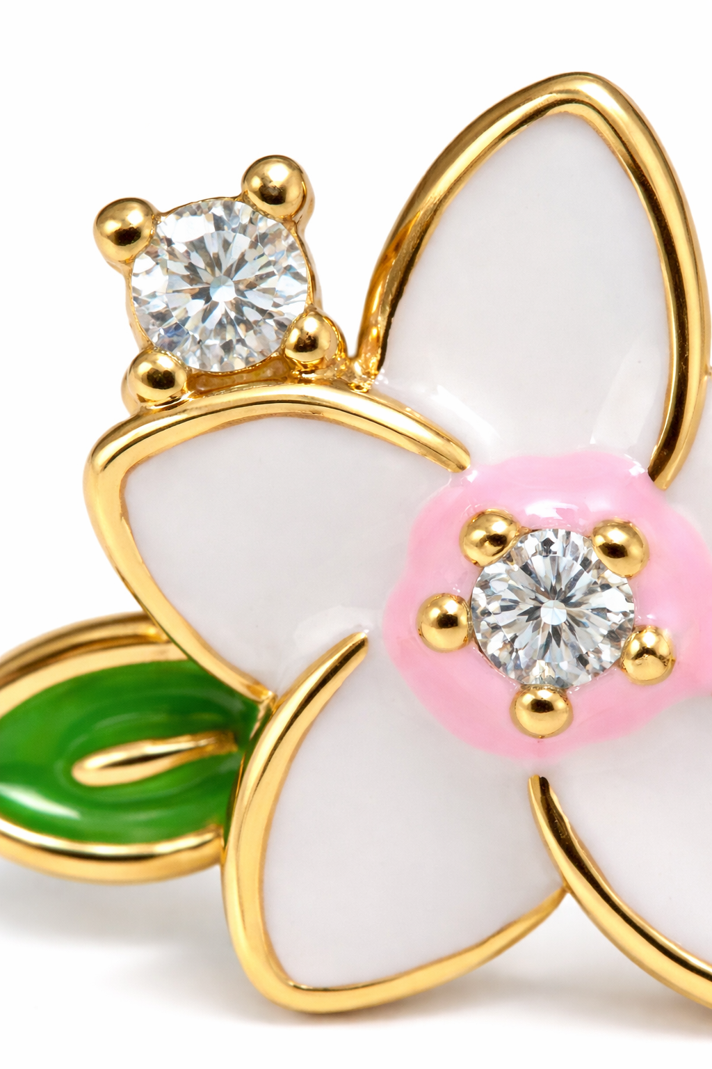 The flower center is adorned with a sparkling crystal stone surrounded by a soft pink enamel accent, while a tiny crystal above adds extra brilliance. A vibrant green enamel leaf detail completes the natural floral design, giving the earrings a cute and refreshing appearance.