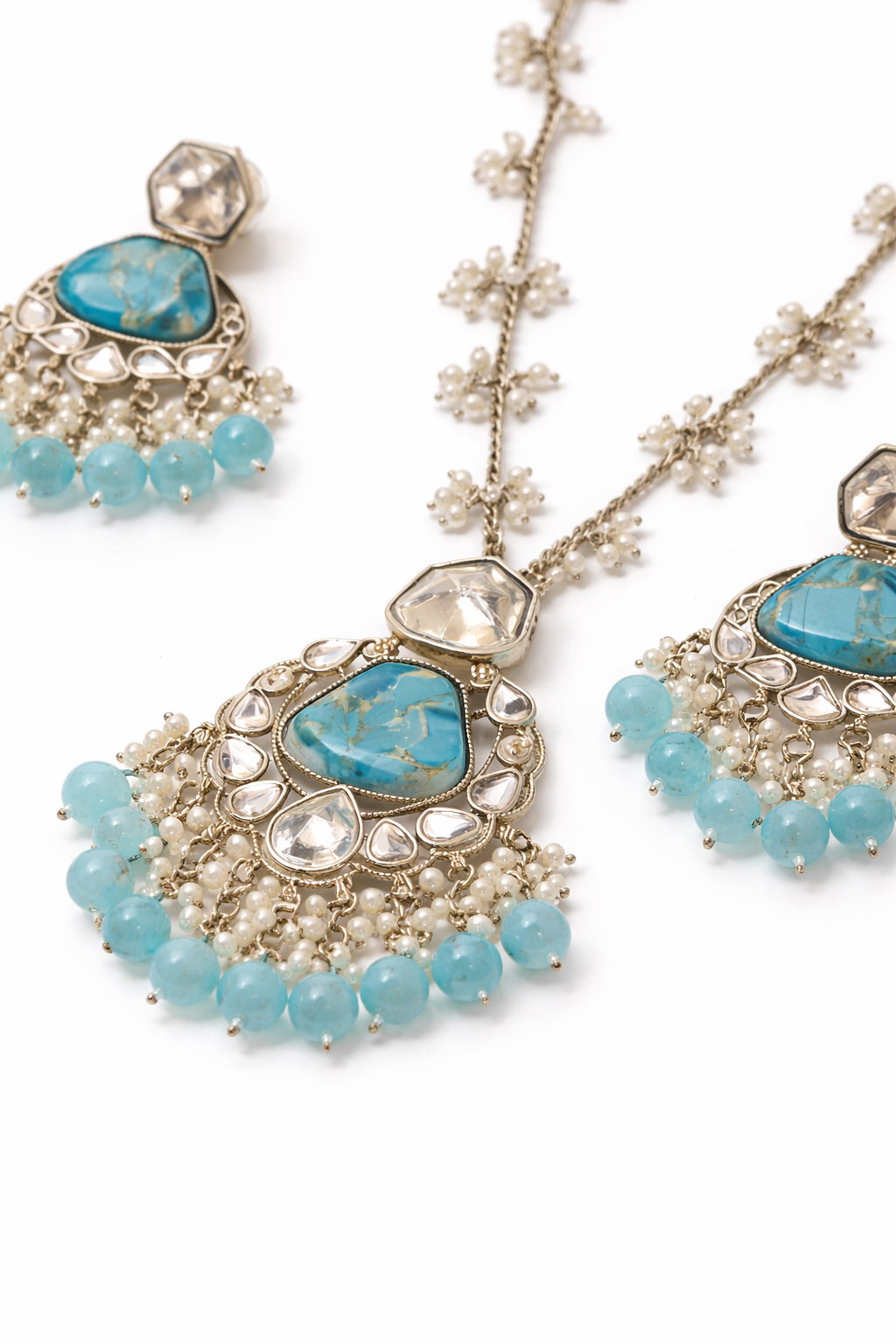 The necklace chain is adorned with subtle pearl clusters, while the matching statement earrings complete the graceful look. The refreshing turquoise blue beads add a modern twist to traditional craftsmanship, making this jewelry set perfect for weddings, festive occasions, parties, and special celebrations.