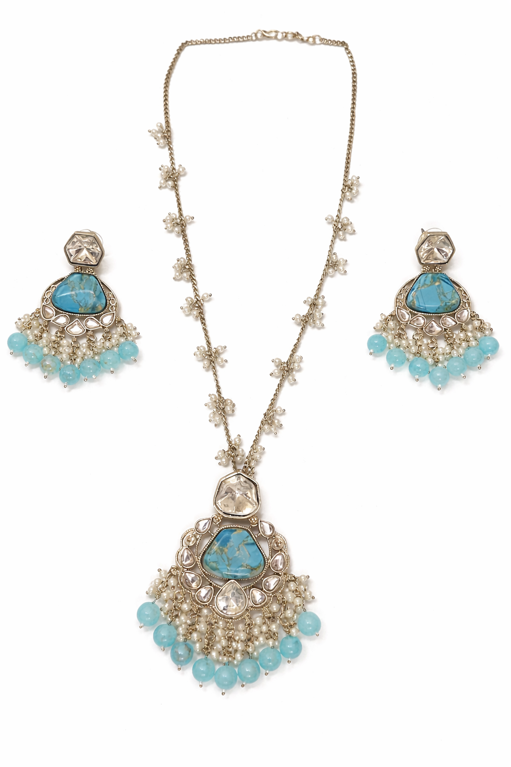 Elevate your ethnic style with this stunning Turquoise Stone Polki Necklace Set crafted in an elegant silver-tone finish. Featuring a beautifully designed pendant with a natural turquoise stone, surrounded by shimmering polki stones and delicate pearl embellishments, this set exudes royal charm.